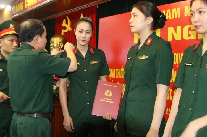 VĐV Hoàng Thị Kiều Trinh của CLB Bộ Tư lệnh Thông tin và ĐT bóng chuyền nữ Việt Nam mới đây đã nhận vinh dự lớn khi được thăng quân hàm lên Đại uý.