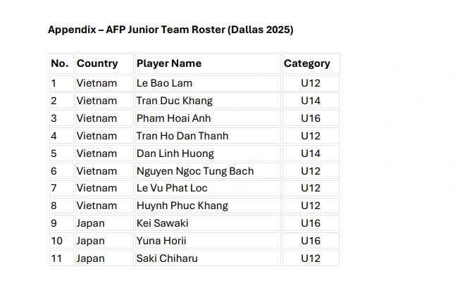 Danh sách đại diện Việt Nam gồm Lê Bảo Lâm, Trần Đức Khang, Phạm Hoài Anh, Trần Hồ Đan Thanh, Đan Linh Hương, Nguyễn Ngọc Tùng Bách, Lê Vũ Phát Lộc và Huỳnh Phúc Khang. Ba vận động viên còn lại đến từ Nhật Bản, gồm Kei Sawaki, Yuna Horii và Saki Chiharu, tạo nên một đội hình trẻ trung, đầy triển vọng.