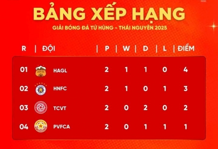 Bảng xếp hạng Cúp Tứ hùng Thái Nguyên 2025 mới nhất: HAGL độc chiếm ngôi đầu, công thần ĐT Việt Nam gây chấn động. Cập nhật lịch thi đấu, kết quả Cúp Tứ hùng Thái Nguyên 2025 nhanh và chính xác nhất.