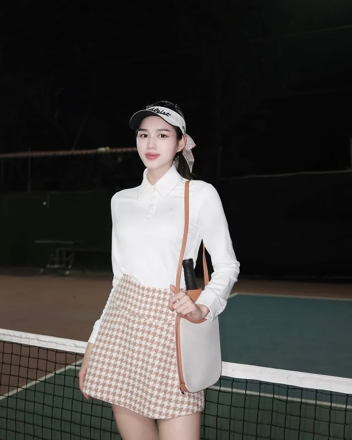 Trong những lần xuất hiện trên sân pickleball, hoa hậu Đỗ Thị Hà thường gây chú ý bởi gu phụ kiện tinh tế. Nổi bật nhất là chiếc bao đựng vợt Courtside Pickleball Paddle Cover thuộc bộ sưu tập The Courtside của thương hiệu FRANK. Phiên bản màu nâu trắng (Cinnamon Brown & White Canvas) được cô ưu ái mang theo nhiều lần, dễ dàng phối hợp với các trang phục thể thao từ áo polo trắng đến quần short năng động, tạo nên tổng thể hài hòa và sang trọng.