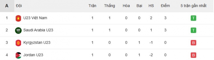 U23 Việt Nam đã tạo nên bất ngờ ngay ở lượt trận mở màn VCK U23 châu Á 2026 khi đánh bại U23 Jordan với tỉ số 2-0. Không những vậy, việc chủ nhà Saudi Arabia chỉ đánh bại Kyrgyzstan với tỉ số 1-0 thì thầy trò HLV Kim Sang Sik tạm thời chiếm ngôi đầu bảng A.