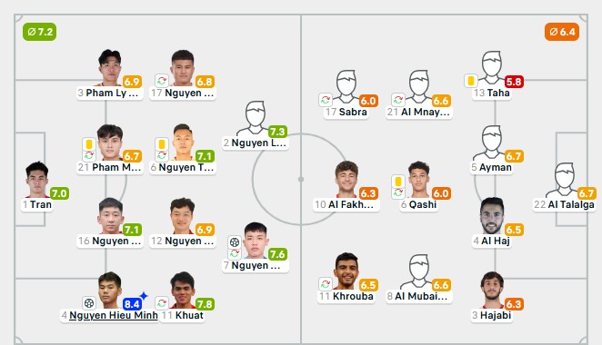 Đáng chú ý, Nguyễn Lê Phát – cầu thủ trẻ nhất trên sân (sinh năm 2007) – nhận 7,3 điểm với 2 cú sút nguy hiểm cùng nhiều pha xử lý tự tin. Phía sau, bộ đôi Nhật Minh và Thái Sơn cùng đạt 7,1 điểm, đóng vai trò "lá chắn" nơi hàng thủ, trong đó Thái Sơn dù nhận thẻ vàng sớm vẫn duy trì tỉ lệ chuyền chính xác ấn tượng 89%. Thủ môn Trung Kiên cũng ghi điểm với 4 pha cản phá quan trọng.