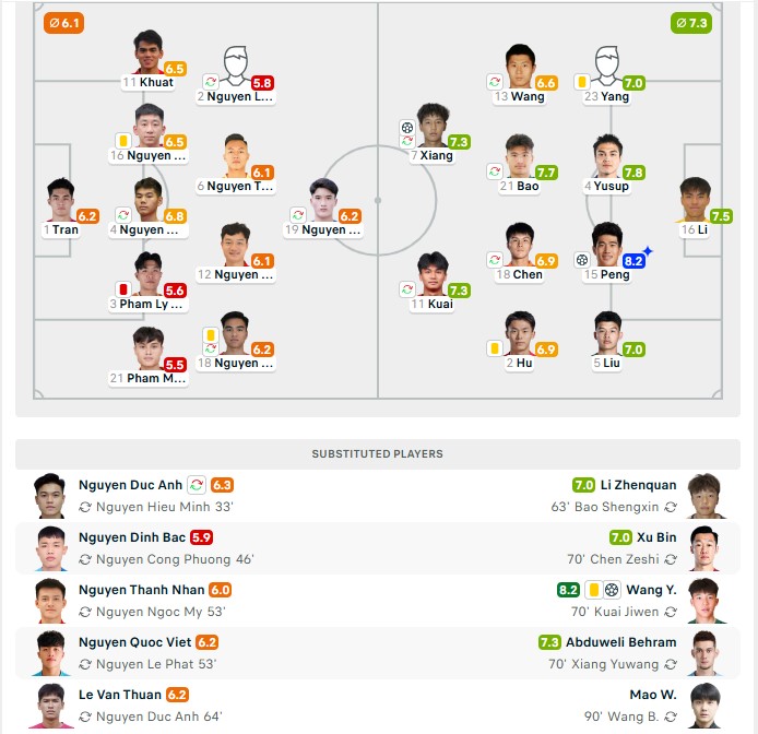 Bên phía U23 Trung Quốc, Peng Xiao và Wang Yudong là hai cái tên nổi bật nhất với cùng 8,2 điểm, còn thủ môn Li Hao cũng có màn trình diễn chắc chắn, được chấm 7,5 điểm.