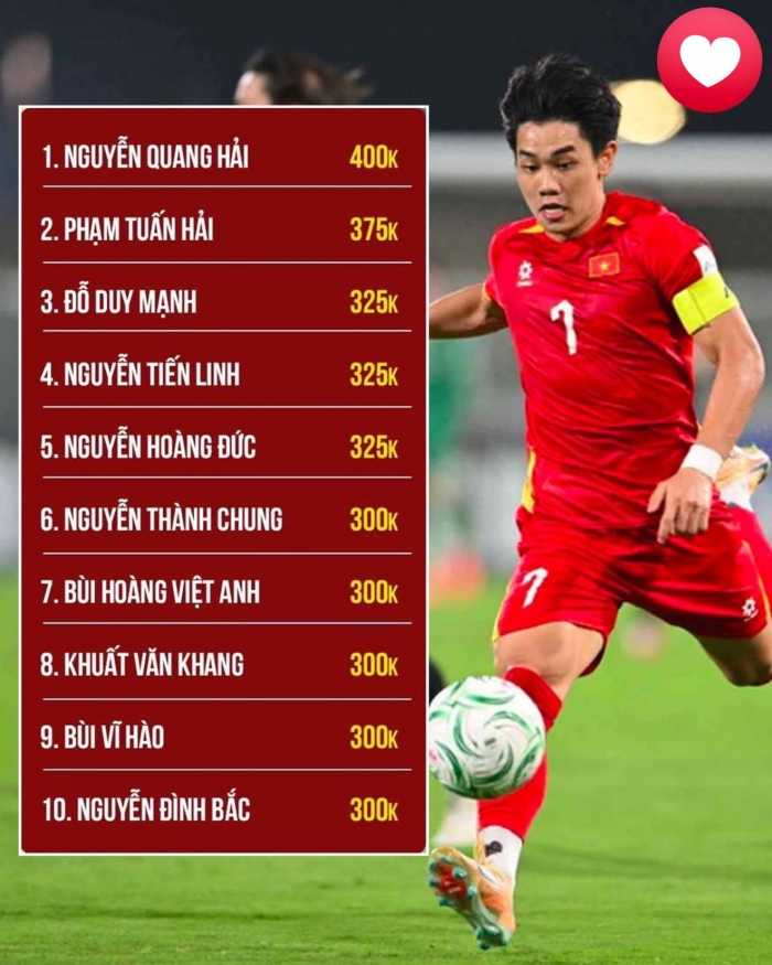 Ở chiều ngược lại, cầu thủ đắt giá nhất bóng đá Việt Nam hiện tại vẫn là Nguyễn Quang Hải. Tiền vệ sinh năm 1997 đang được Transfermarkt định giá 400.000 euro, dẫn đầu bảng xếp hạng và bỏ xa nhiều trụ cột khác của đội tuyển quốc gia. Trong suốt sự nghiệp, Quang Hải đã chứng minh giá trị đặc biệt của mình, từng được đồng đội Bùi Tiến Dũng ví là mẫu cầu thủ "100 năm bóng đá Việt Nam mới có một".