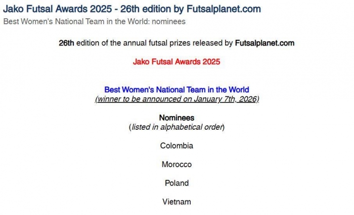 Ba cái tên còn lại trong danh sách đề cử gồm Colombia, Maroc và Ba Lan. Đáng chú ý, những đội tuyển có thành tích rất cao tại World Cup futsal nữ như Brazil – nhà vô địch, hay Bồ Đào Nha – á quân, lại không góp mặt. Điều này khiến giới chuyên môn và người hâm mộ không khỏi tò mò, bởi đến thời điểm hiện tại, tiêu chí bình chọn của Futsal Planet cho hạng mục này vẫn chưa được công bố rõ ràng.