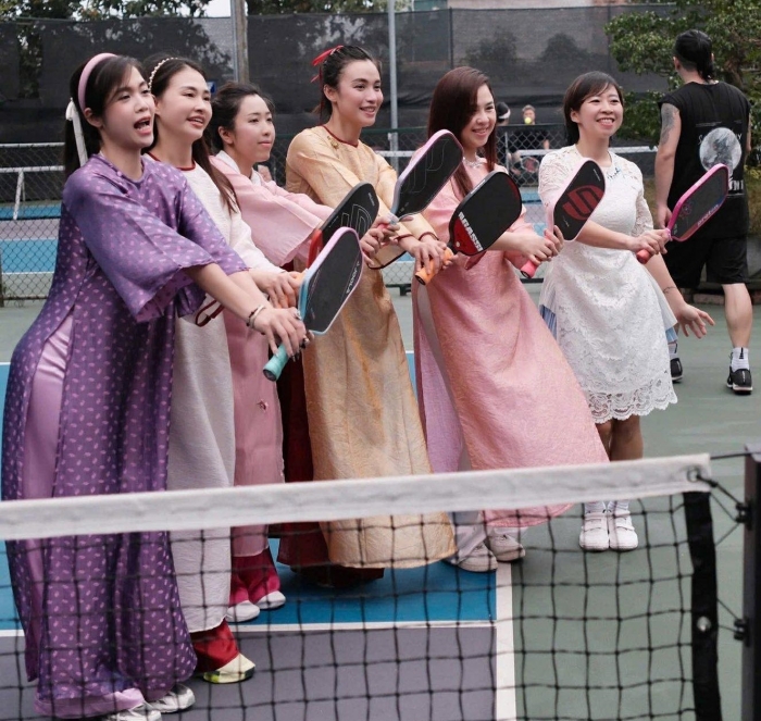 Trên các sân pickleball, nhiều cô gái khoác lên mình những bộ áo dài rực rỡ sắc màu, mang đậm không khí xuân. Sự kết hợp giữa trang phục truyền thống và bộ môn thể thao hiện đại mang đến cảm giác mới mẻ, góp phần làm phong phú thêm hình ảnh pickleball trong đời sống thường ngày.