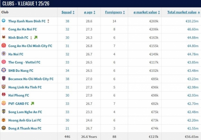 BXH giá trị đội hình các CLB tại V.League: Thanh Hóa xếp cuối cùng, Top 1 gây thất vọng lớn