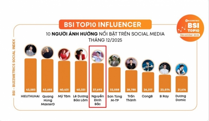 Cụ thể, theo thống kê do BuzzMetrics công bố, Nguyễn Đình Bắc đứng thứ 5 trong danh sách 10 nhân vật có sức ảnh hưởng nhất trên mạng xã hội trong tháng 12/2025. Đây được xem là hiện tượng hiếm, bởi bảng xếp hạng này lâu nay gần như là sân chơi riêng của các nghệ sĩ nổi tiếng. Việc một cầu thủ trẻ xuất hiện ở nhóm đầu cho thấy hình ảnh của Đình Bắc đã vượt ra khỏi khuôn khổ thể thao thuần túy.