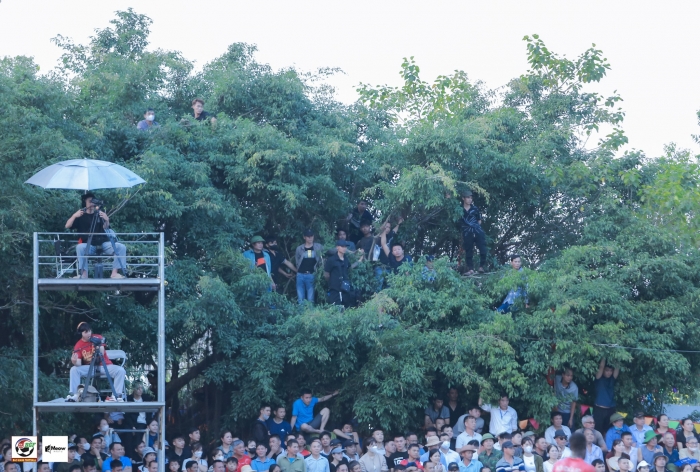 Ngay từ sáng sớm, các lối vào khu sân đã chật kín người. Dòng người đổ về tụ hội quanh sân bóng nằm lọt thỏm giữa cánh đồng và rặng cây, tạo nên bức tranh vừa bình dị vừa sôi động. Cờ hội đỏ rực tung bay, tiếng loa phát thanh vang xa cùng nhịp trống dồn dập khiến bầu không khí đặc quánh chất lễ hội truyền thống.