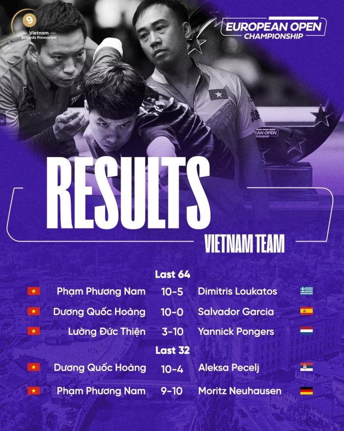 Trong ngày 13/3, cả ba cơ thủ hàng đầu Việt Nam là Dương Quốc Hoàng, Phạm Phương Nam và Lường Đức Thiện đều có các trận đấu ở vòng Last 64 European Open Pool Championship 2026. Mặc dù vậy, chỉ có 2 người giành quyền đi tiếp vào vòng Last 32.