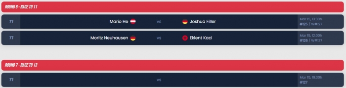 Cặp đấu còn lại sẽ là trận chiến giữa Mario He và Joshua Filler. Tay cơ người Đức đang thể hiện phong độ hủy diệt ở giải đấu năm nay và được xem là ứng viên số một cho chức vô địch nhưng Mario He với những gì đã thể hiện cũng được kỳ vọng sẽ tạo ra bất ngờ ở Bán kết. Trận đấu này dự kiến diễn ra lúc 19h30.