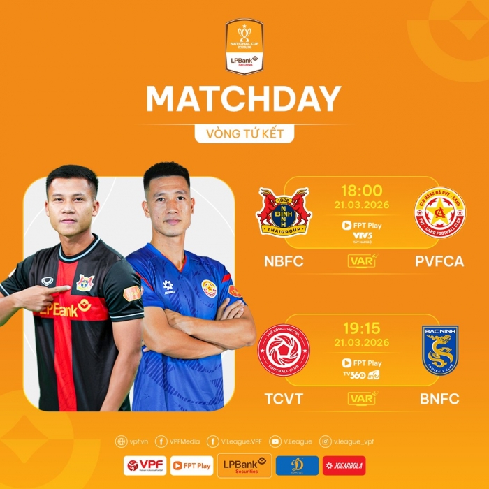 Theo lịch thi đấu ngày 21/3, Cúp Quốc gia 2025/2026 tiếp tục diễn ra với hai trận tứ kết còn lại, hứa hẹn mang đến bầu không khí sôi động. Tâm điểm là cuộc đối đầu giữa Ninh Bình FC và PVF-CAND, bên cạnh màn so tài giữa Thể Công Viettel và Bắc Ninh FC.