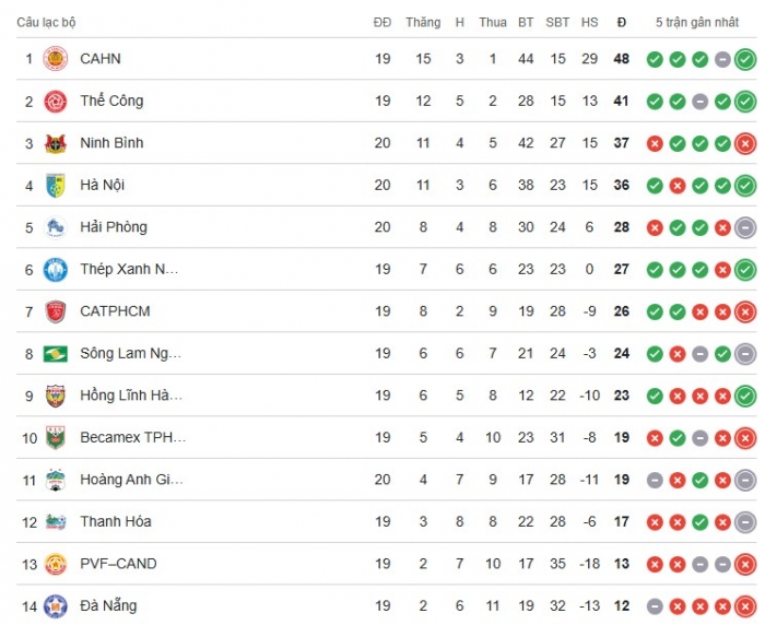Bảng xếp hạng V.League mới nhất 24/4: Sau khi các trận đấu của vòng 20 trong ngày hôm nay khép lại thì Hà Nội FC đã áp sát top 3 của Ninh Bình trong HAGL chưa thể yên tâm ở cuộc đua trụ hạng.