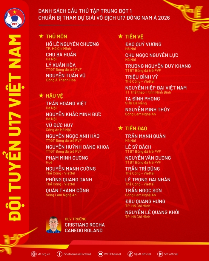 VFF mới đây đã công bố danh sách các cầu thủ được triệu tập lên U17 Việt Nam chuẩn bị cho giải vô địch U17 Đông Nam Á 2026.