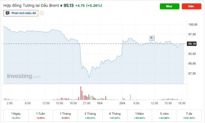 Cùng thời điểm, giá dầu Brent giao dịch ở mức 95,13 USD/thùng, tăng 4,75 USD/thùng, tương đương mức tăng 5,25% so với chốt phiên tuần trước.