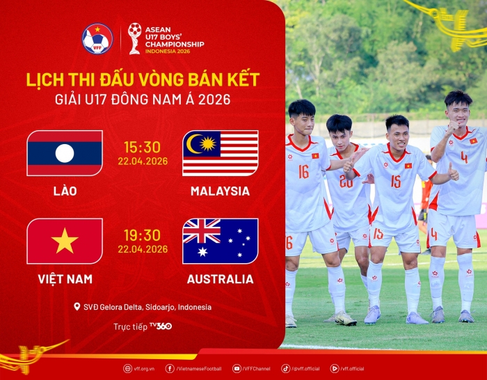 Lịch thi đấu Bán kết U17 Đông Nam Á 2026: U17 Việt Nam đấu với U17 Australia khi nào; U17 Lào được dự đoạn gặp khó trước U17 Malaysia.