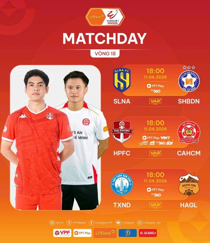 Cũng trong ngày 11/4, vòng 18 V.League 2025/26 tiếp tục sôi động với 3 trận đấu đồng loạt diễn ra lúc 18h00. Trên sân nhà, SLNA, Hải Phòng và Nam Định sẽ lần lượt tiếp đón các đối thủ SHB Đà Nẵng, Công an TP.HCM và HAGL. Đáng chú ý nhất có lẽ là cuộc đối đầu trên sân Thiên Trường giữa Nam Định và HAGL khi đội bóng được dẫn dắt bởi HLV Vũ Hồng Việt cho thấy đà hồi sinh vô cùng mạnh mẽ, sẵn sàng cạnh tranh vị trí trong top 3 V.League mùa này.