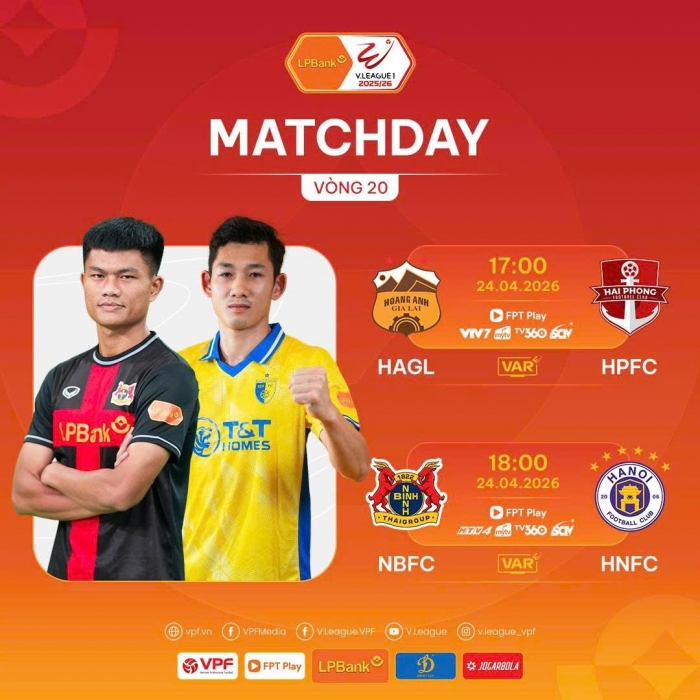 Lịch thi đấu bóng đá Việt Nam hôm nay 23/4: U17 Việt Nam đá Chung kết U17 Đông Nam Á 2026 gặp U17 Malaysia lúc mấy giờ. Sôi động các trận đấu tại vòng 20 V.League. Ninh Bình vs Hà Nội FC; HAGL đấu Hải Phòng.