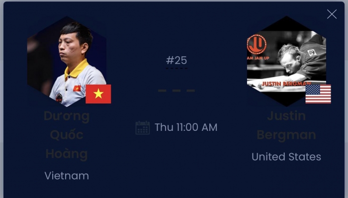 Sau lễ bốc thăm thì các cơ thủ đều đã biết được đối thủ của mình ở vòng 1. Cái tên nhận được nhiều sự chú ý nhất của người hâm mộ billiards Việt Nam không ai khác ngoài Dương Quốc Hoàng. Cơ thủ sinh năm 1987 sẽ chạm trán với tay cơ chủ nhà Mỹ Justin Bergman ở vòng 1 và màn so tài này dự kiến sẽ diễn ra lúc 23h00 ngày 2/4 (giờ Việt Nam).