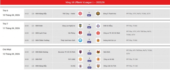 Vòng 18 của V.League 2025/26 sẽ diễn ra trong 3 ngày từ 10-12/4 với rất nhiều trận đấu hấp dẫn. Trận đấu sớm nhất vòng 18 sẽ là cuộc đối đầu giữa Viettel và Thanh Hóa trên sân Hàng Đẫy lúc 19h15 ngày 10/4. Đây sẽ là thử thách không nhỏ dành cho đoàn quân của HLV Popov khi Thanh Hóa đang rất tự tin sau giai đoạn nghỉ giữa mùa.