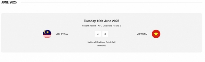 Trước đó, AFC đã ra quyết định xử thua 0-3 đối với Malaysia trong các trận gặp Việt Nam và Nepal do vi phạm quy định liên quan đến cầu thủ. Tuy nhiên, trên website chính thức, FAM vẫn hiển thị tỷ số 4-0 trước Việt Nam như kết quả ban đầu trên sân, thay vì cập nhật theo phán quyết mới nhất, khiến dư luận không khỏi bất ngờ.