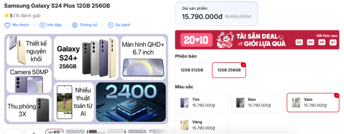 Theo khảo sát tại một số đại lý bán lẻ chính hãng, giá Galaxy S24 Plus đang dao động trong khoảng 16 - 21 triệu đồng, giảm gần 9 triệu so với mức niêm yết. Cụ thể, phiên bản 256GB chỉ còn 15.790.000 đồng, còn bản 512GB nhỉnh hơn chút ở mức 21.190.000 đồng, giá rẻ “oanh tạc” cả iPhone 13.