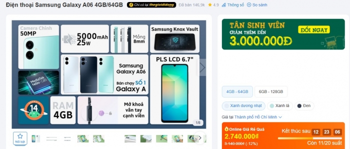 Hiện tại. Galaxy A06 đang được bán với giá từ 2.740.000 đồng cho cấu hình 4GB/64GB, tăng lên 3.730.000 đồng cho bản 6GB/128GB, mức giá rẻ khiến mọi đối thủ phải “dè chừng”.