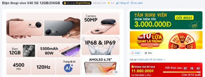 Sau khi vivo V60 ra mắt, giá bán các dòng sản phẩm cũ liên tục giảm mạnh. Trong đó, vivo V40 được coi là chiếc điện thoại vivo tầm trung ăn khách bậc nhất hiện nay.