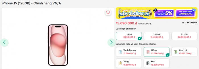 - iPhone 15 - 128GB: 15.690.000 đồng