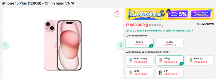 Cụ thể, giá iPhone 15 Plus fullbox mới nhất ngày 25/10 chỉ từ 17.69 triệu đồng cho bộ nhớ 128GB, tăng lên 21.69 triệu cho bộ nhớ 256GB, vẫn rẻ hơn iPhone 17 gần 4 triệu đồng.