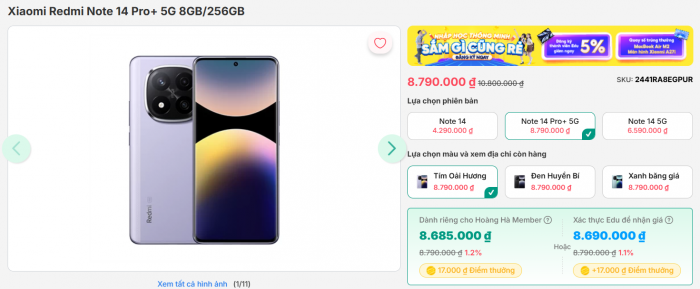Cụ thể, giá đập hộp Redmi Note 14 Pro+ đã chạm mốc 8.790.000 đồng cho cấu hình RAM 8GB và bộ nhớ 256GB. Với giá bán này, Redmi Note 14 Pro+ thực sự là hung thần của Galaxy A55.
