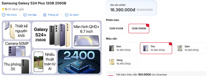 Giữa tháng 10, giá Galaxy S24 Plus chạm mốc 16.390.000 đồng cho mẫu 256GB, nhỉnh hơn ở mức 21.190.000 đồng cho bản 512GB, vẫn rẻ hơn iPhone 16 Plus rất nhiều mà AI toàn diện ngang ngửa iPhone 17.