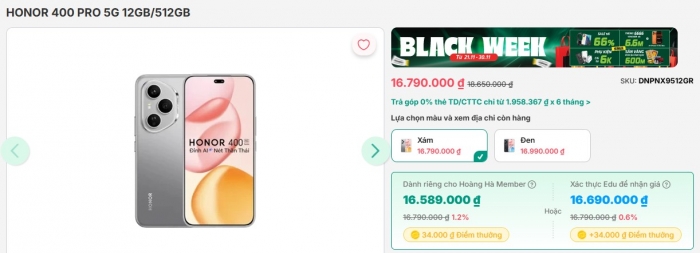 Sau thời gian ngắn ra mắt, HONOR 400 Pro đã được giảm gần 2 triệu đồng, chỉ còn 16.790.000 đồng cho cấu hình 12GB/512GB, vẫn rẻ hơn giá bán của đối thủ iPhone 17 cả chục triệu đồng.