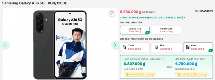 Hiện tại, khách Việt có thể sở hữu chiếc Galaxy A36 với giá rẻ nhất chỉ từ 6.890.000 đồng cho cấu hình 8GB/128GB, tăng lên 8.230.000 đồng cho bản 8GB/256GB và cao nhất 9.210.000 đồng cho bản 12GB/256GB, chỉ rẻ bằng ⅓ người anh em Galaxy S cao cấp.