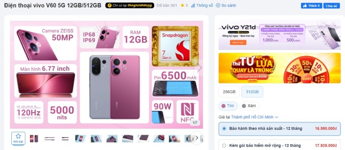 Cụ thể, vivo V60 hiện đang được bán với giá 16.99 triệu đồng cho cấu hình RAM 12GB và bộ nhớ 512GB, vẫn rẻ hơn nhiều khi so sánh với hai đối thủ Galaxy S25 và iPhone 17 cùng cấu hình lưu trữ.