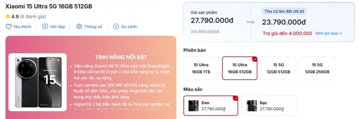Cuối tháng 11, giá Xiaomi 15 Ultra chạm mốc 27.79 triệu đồng cho mẫu 512GB, tăng lên 30.99 triệu đồng cho mẫu 1TB. Với giá bán này, Xiaomi 15 Ultra vẫn là một món hời khi so sánh với đối thủ iPhone 17 Pro Max.