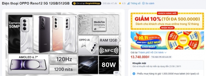 Theo khảo sát mới nhất tại một số đại lý bán lẻ chính hãng, khách hàng có thể đập hộp chiếc OPPO Reno12 5G cấu hình 12GB/512GB với giá chỉ từ 13.740.000 đồng, rẻ hơn đối thủ Galaxy S25 gần 7 triệu đồng.