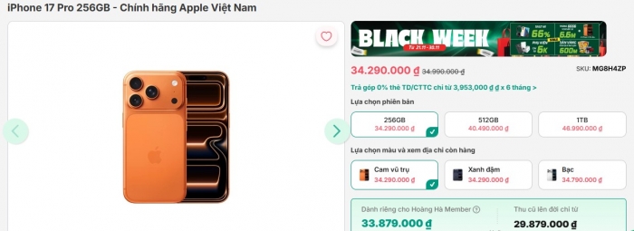 - iPhone 17 Pro - 256GB: 34.290.000 đồng