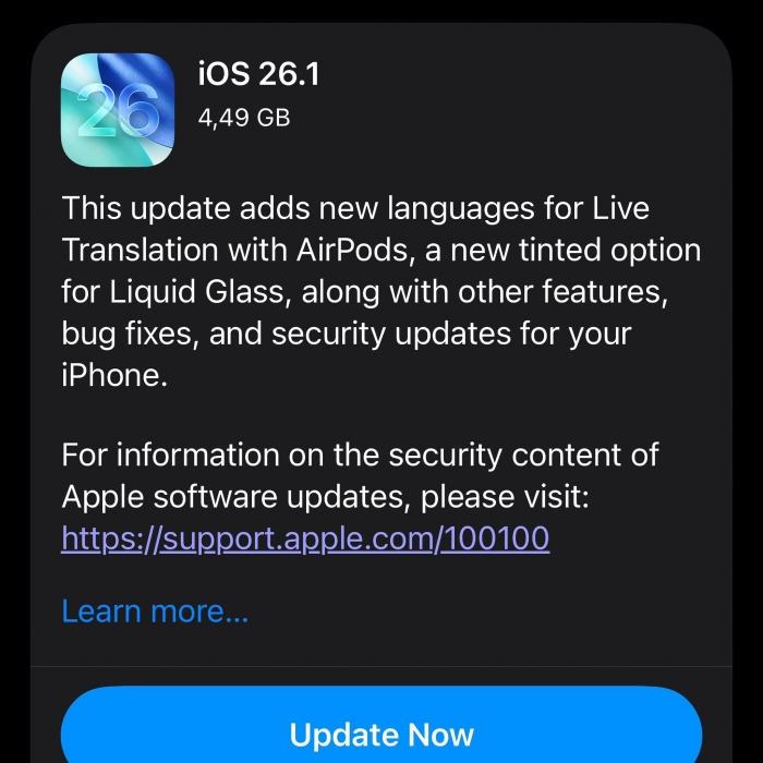 Để tải về iOS 26.1, người dùng có thể truy cập General > Software Update để tiến hành nâng cấp. Lưu ý nên đảm bảo pin trên 50% và kết nối Wi-Fi ổn định vì đây là bản cập nhật dung lượng lớn. Cùng với iOS 26.1, Apple cũng phát hành đồng loạt iPadOS 26.1, macOS Tahoe 26.1, tvOS 26.1, watchOS 26.1 và visionOS 26.1.