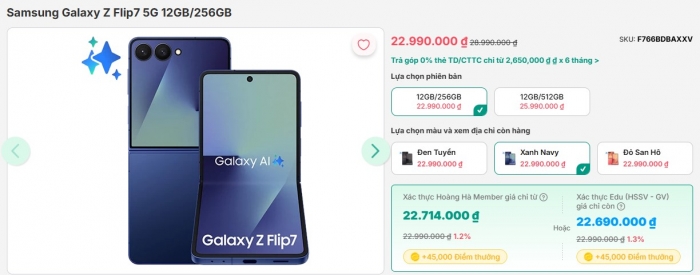 Càng về giữa tháng 12, giá đập hộp Galaxy Z Flip7 càng giảm mạnh hấp dẫn. Theo ghi nhận, giá Galaxy Z Flip7 hiện chạm mốc 22.99 triệu cho bản 256GB, tăng lên 25.99 triệu cho mẫu 512GB. Với giá bán này, Galaxy Z Flip7 vẫn rẻ hơn iPhone 17 tới gần 5 triệu đồng.