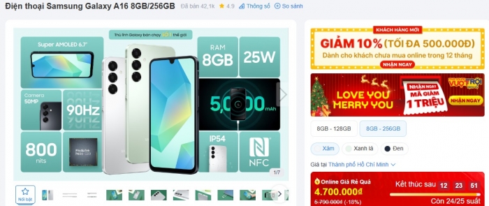Cụ thể, chiếc Galaxy A16 128GB hiện đang được phân phối chính hãng với giá 4.9 triệu đồng, phiên bản 256GB thậm chí còn rẻ hơn ở mức 4.7 triệu đồng, rẻ bằng 1/4 Galaxy S25 nhưng vẫn có màn hình 6.7 inch, camera 50MP và pin 5.000 mAh ấn tượng.