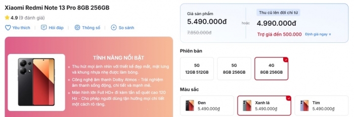 Trong phân khúc tầm trung tại Việt Nam hiện nay, Redmi Note 13 Pro 4G là cái tên nổi bật bậc nhất. Hiện tại, nó đang được bán với giá chỉ 5.49 triệu cho mẫu 256GB, rẻ chưa bằng 1/4 Galaxy S25 Ultra nhưng vẫn được trang bị camera 200MP xịn sò chẳng kém.