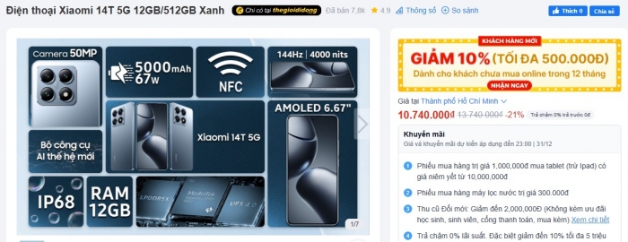 Đầu tháng 12, Xiaomi 14T đang được bán với giá chỉ 10.740.000 đồng cho cấu hình RAM 12GB và bộ nhớ 512GB, mức giá khiến đối thủ nào cũng phải ngậm ngùi vì không cạnh tranh nổi với loạt trang bị mà nó sở hữu.