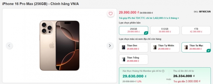 - iPhone 16 Pro Max - 256GB: 29.690.000 đồng