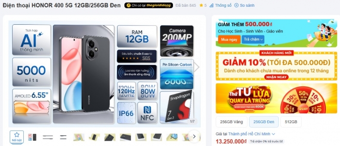 Hiện tại, HONOR 400 5G đang được bán với giá chỉ 13.250.000 đồng cho bộ nhớ 256GB, tăng lên 14.230.000 đồng cho mẫu 512GB, vẫn rẻ hơn đối thủ Galaxy S25 Ultra cả chục triệu đồng nên được rất nhiều khách Việt quan tâm.