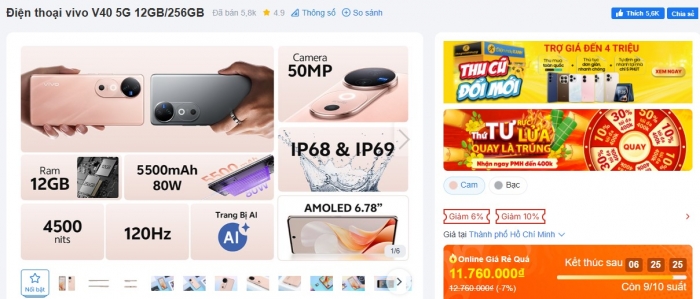 Hiện tại, vivo V40 5G đang là chiếc điện thoại Android tầm trung nổi bật với giá bán rẻ và trang bị hấp dẫn. Cụ thể, vivo V40 5G có giá chỉ 11.760.000 đồng cho phiên bản 12GB/256GB.