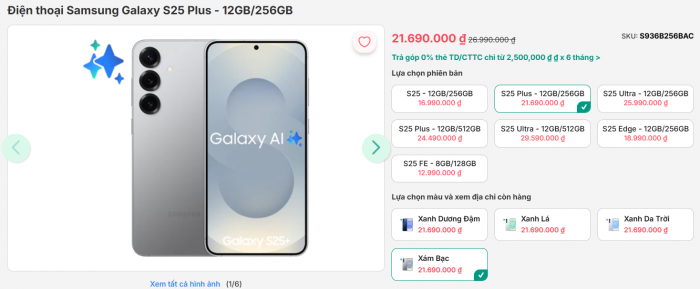 Hiện tại, Galaxy S25 Plus đang được phân phối chính hãng tại Việt Nam với giá 21.69 triệu cho bản 256GB và 24.49 triệu cho bản 512GB. So với thời điểm mới ra mắt, giá Galaxy S25 Plus đã giảm tới 6 triệu đồng, vẫn rẻ hơn đối thủ iPhone Air gần 8 triệu đồng.