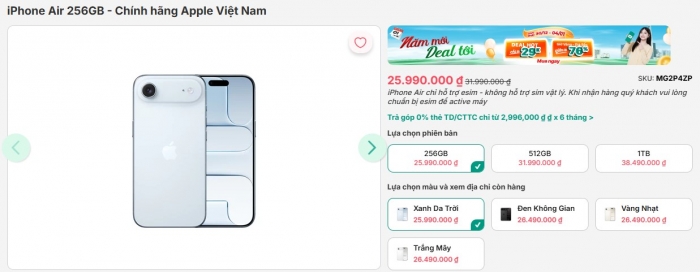 - iPhone Air - 256GB: 25.990.000 đồng
