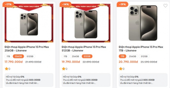 Theo khảo sát nhanh sáng 15/1, giá iPhone 15 Pro Max Like New hiện đang dao động từ 17 - 20 triệu đồng, cụ thể như sau: