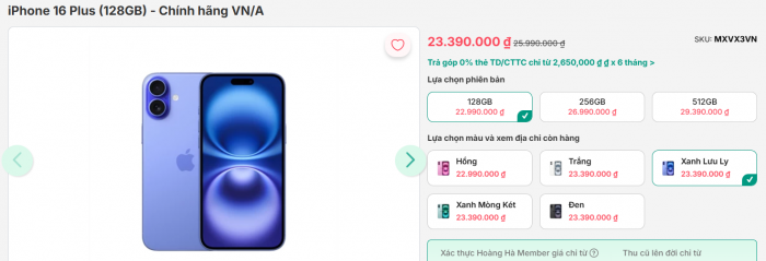 - iPhone 16 Plus - 128GB: 22.990.000 đồng